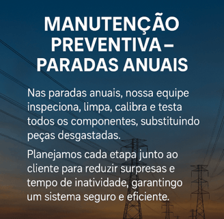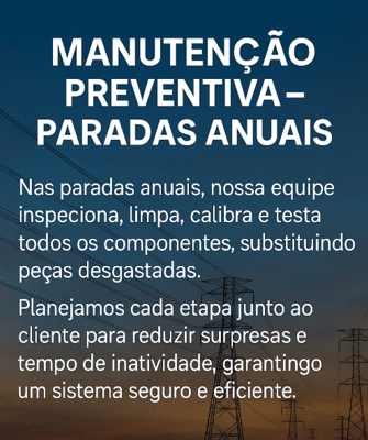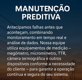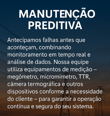 Manutenção Preventiva com foco na preservação dos ativos, possuimos mão de obra qualificada e utilizamos equipamentos de ensaio para certificar a qualidade da manutenção, nosso foco é manter o sistema disponivel 24 horas sem interrupções.